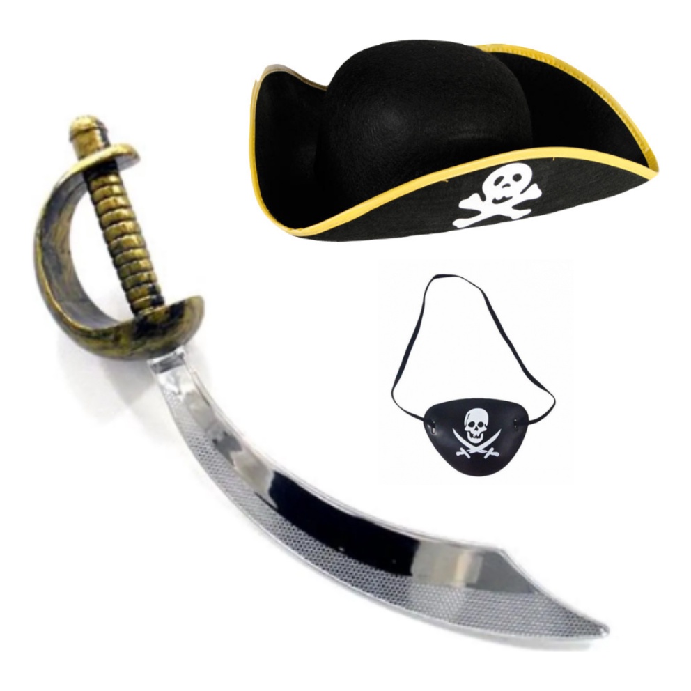 Kit Pirata Infantil - Aventura dos Sete Mares tapa olho chapeu brinco espada colete e gancho para as maos
