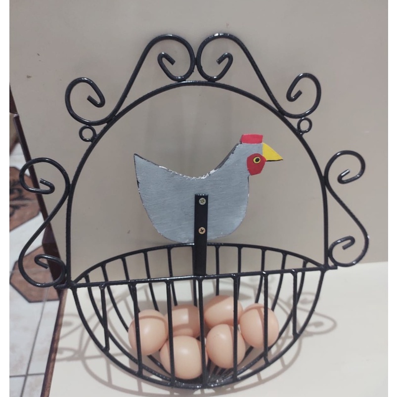 Porta ovo de parede em ferro com detalhe de uma galinha como decoração, um produto que pode decorar ambientes como cozinhas, restaurantes, cafés entre outros ambientes.