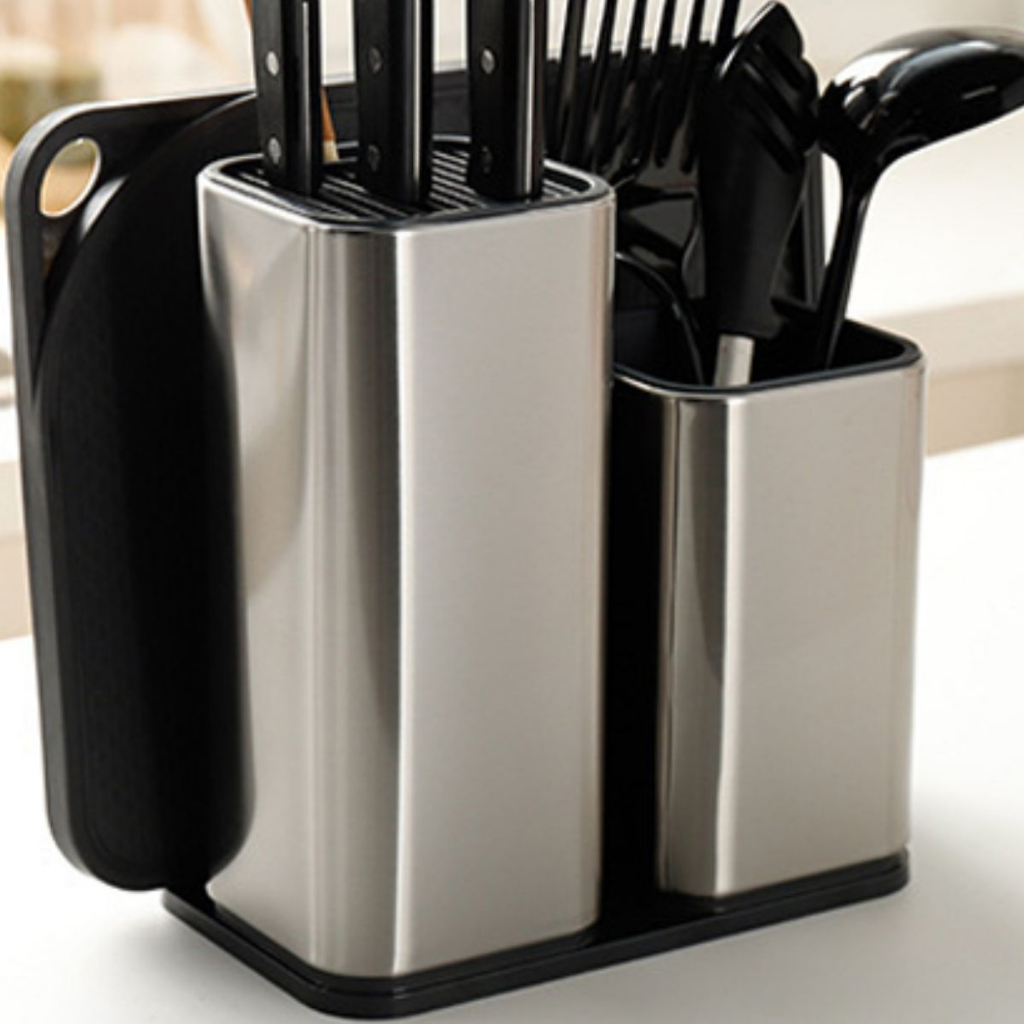 KIT 3 Utensílios Escorredor De Facas Em Inox E Escorredor De Talheres Em Inox E Tabua Para Corte