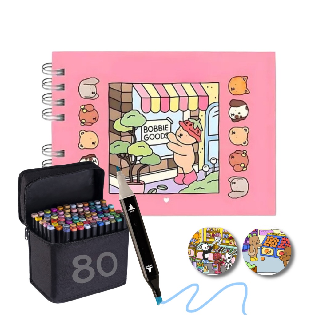 Kit Livro De Colorir Bobbie Goods Capa Dura 50 Páginas + Canetinhas e separados Colorir Ponta Dupla Marca TextO 24/36