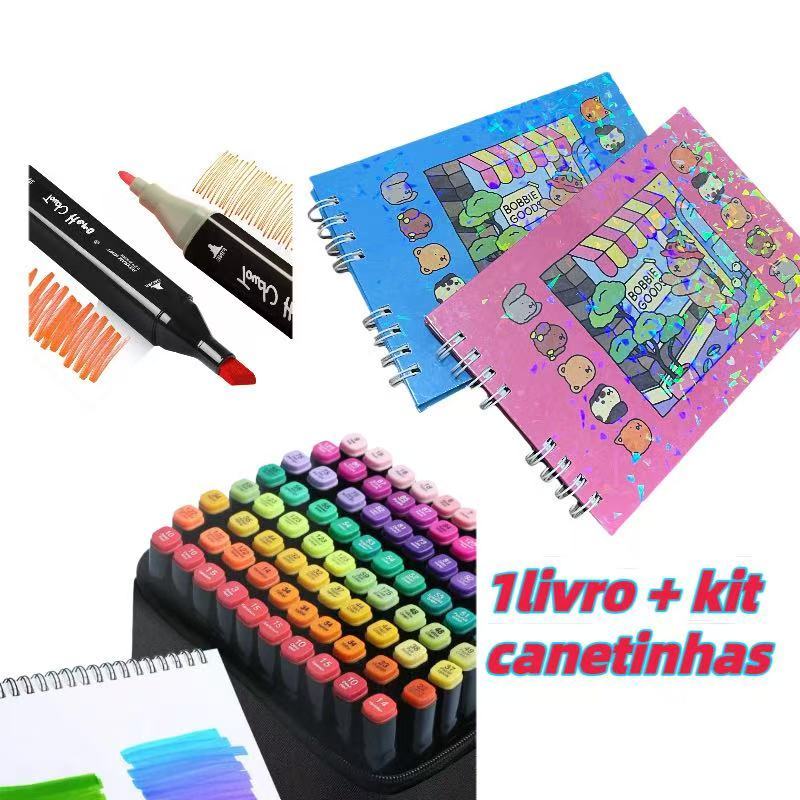 Kit Livro De Colorir Bobbie Goods Capa Dura 50 Páginas + Canetinhas Ponta Dupla Marca Texto 24/36/48/60/80/120 Escolar