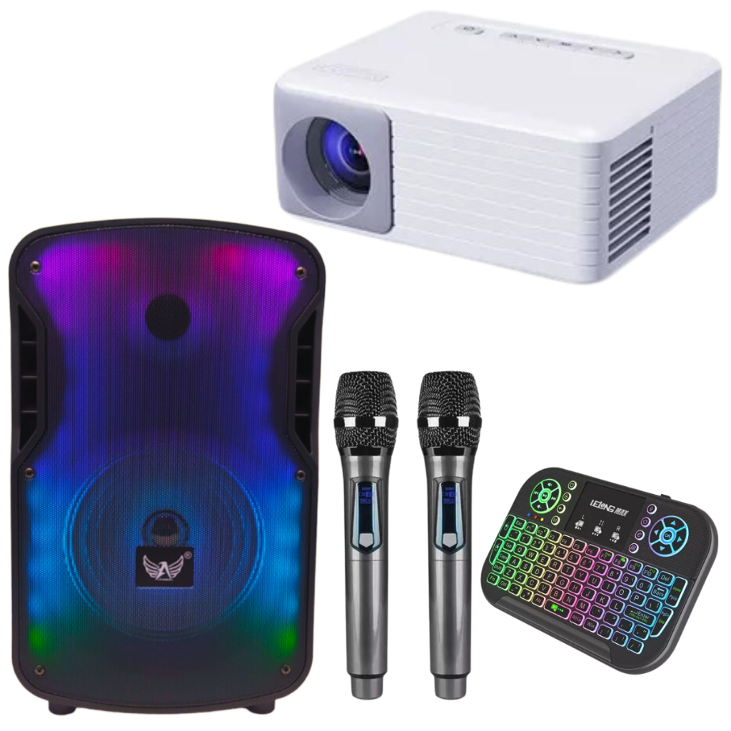 Karaoke Box Projetor Caixa De Som Microfones Sem Fio Completo