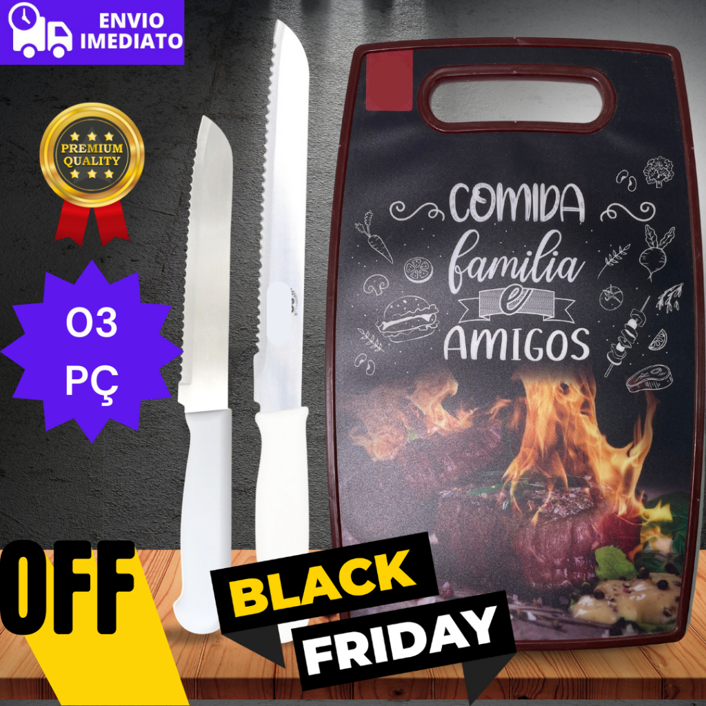 Kit Conjunto 3 Peças Cozinha Faca de Pão Serrada Grande e Media Tabua de Cortes Carne Pão