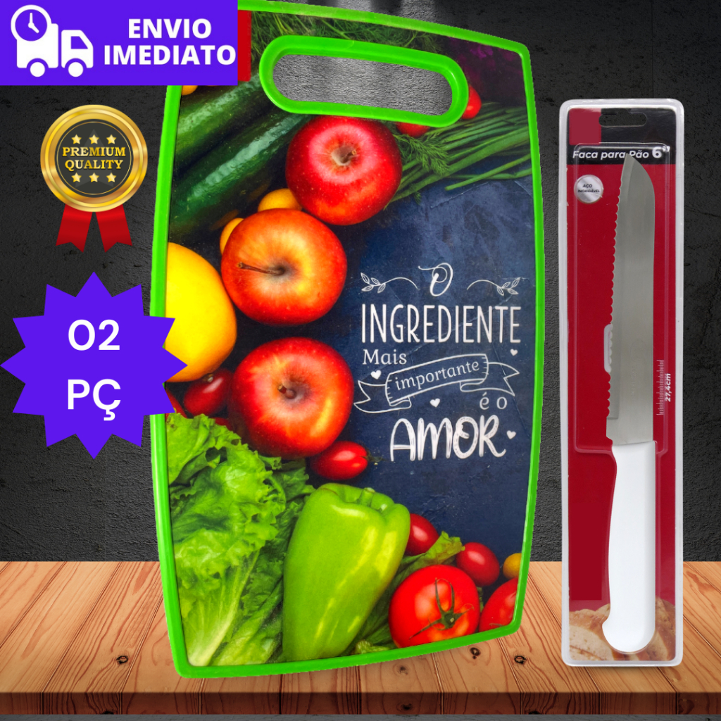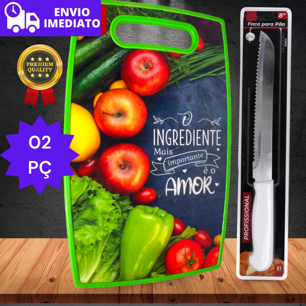 Kit Conjunto Faca de Pão Serrada Grande e Tabua de Cortar Carne Pão