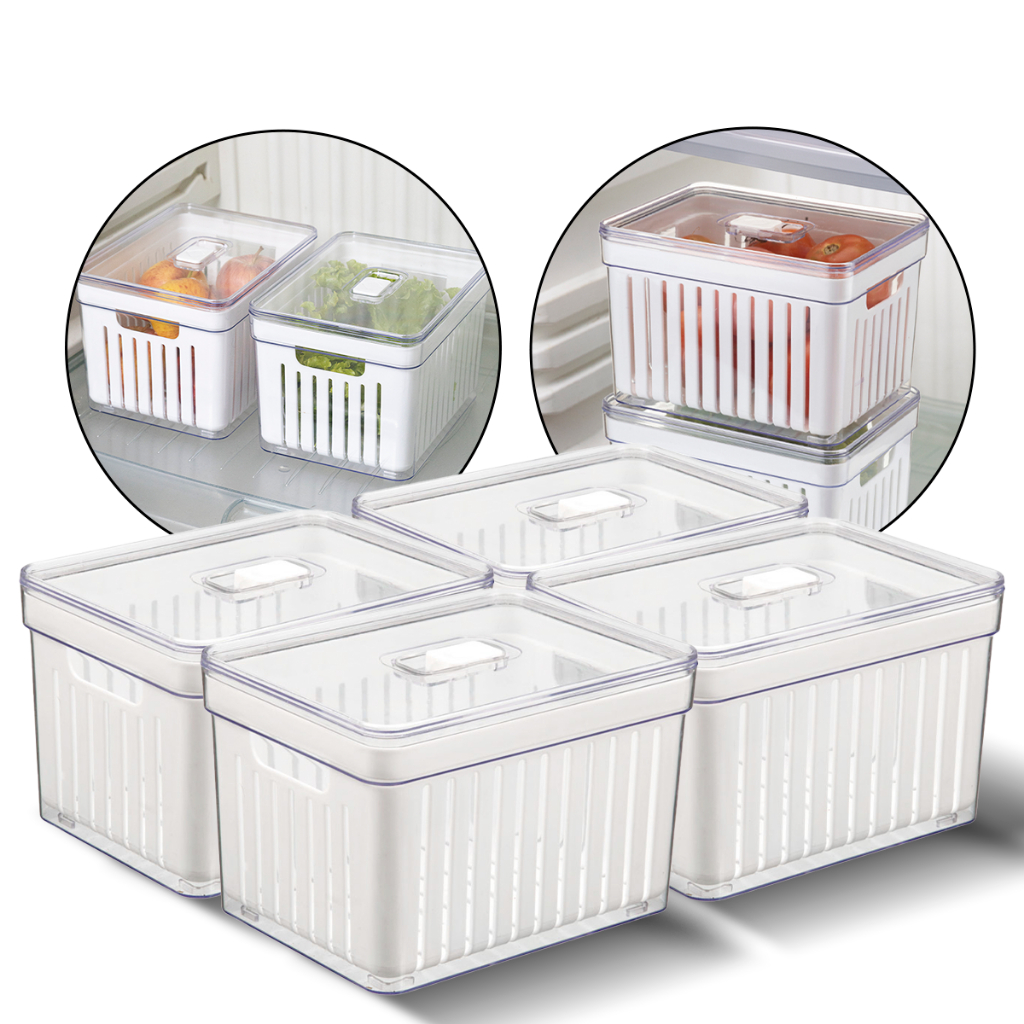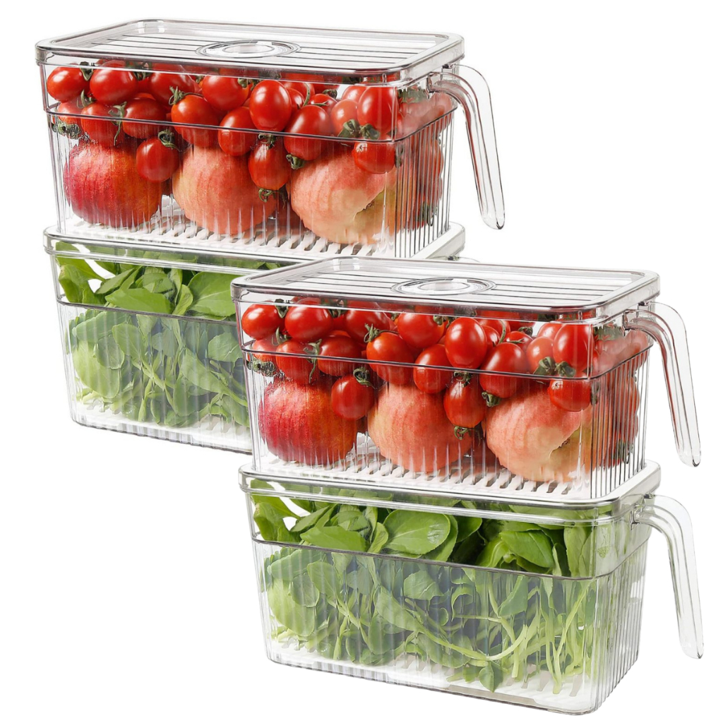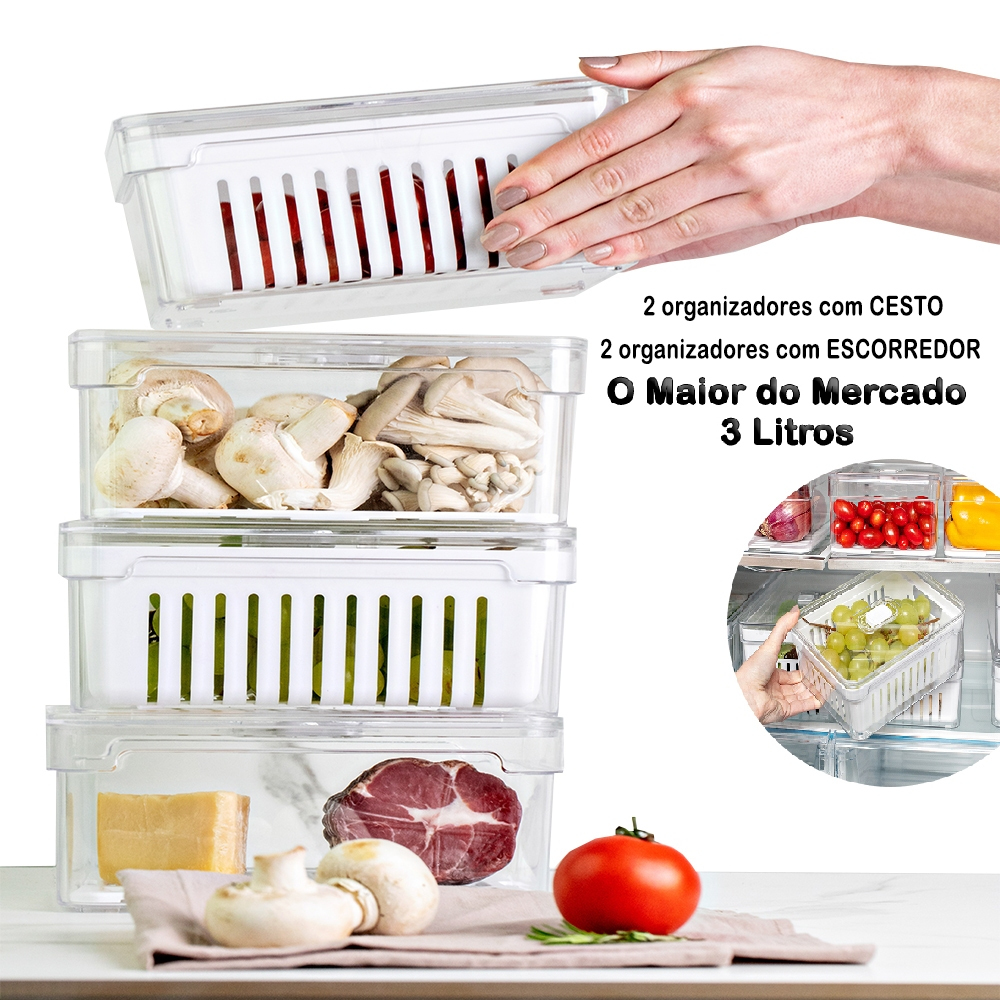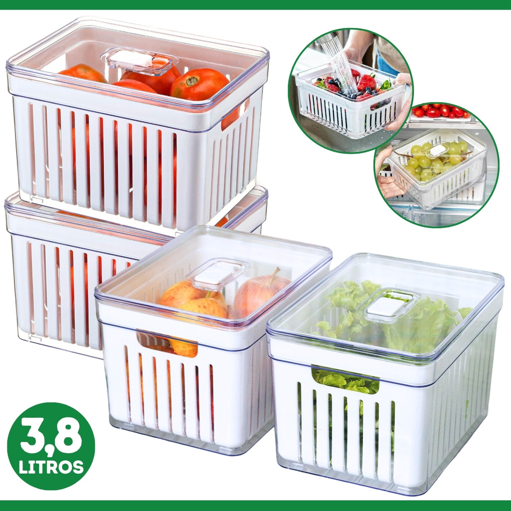 Kit 4 Organizador de Geladeira 3,8L Com Tampa Multiuso Bandeja Drenagem Alimentos Verduras Vegetais