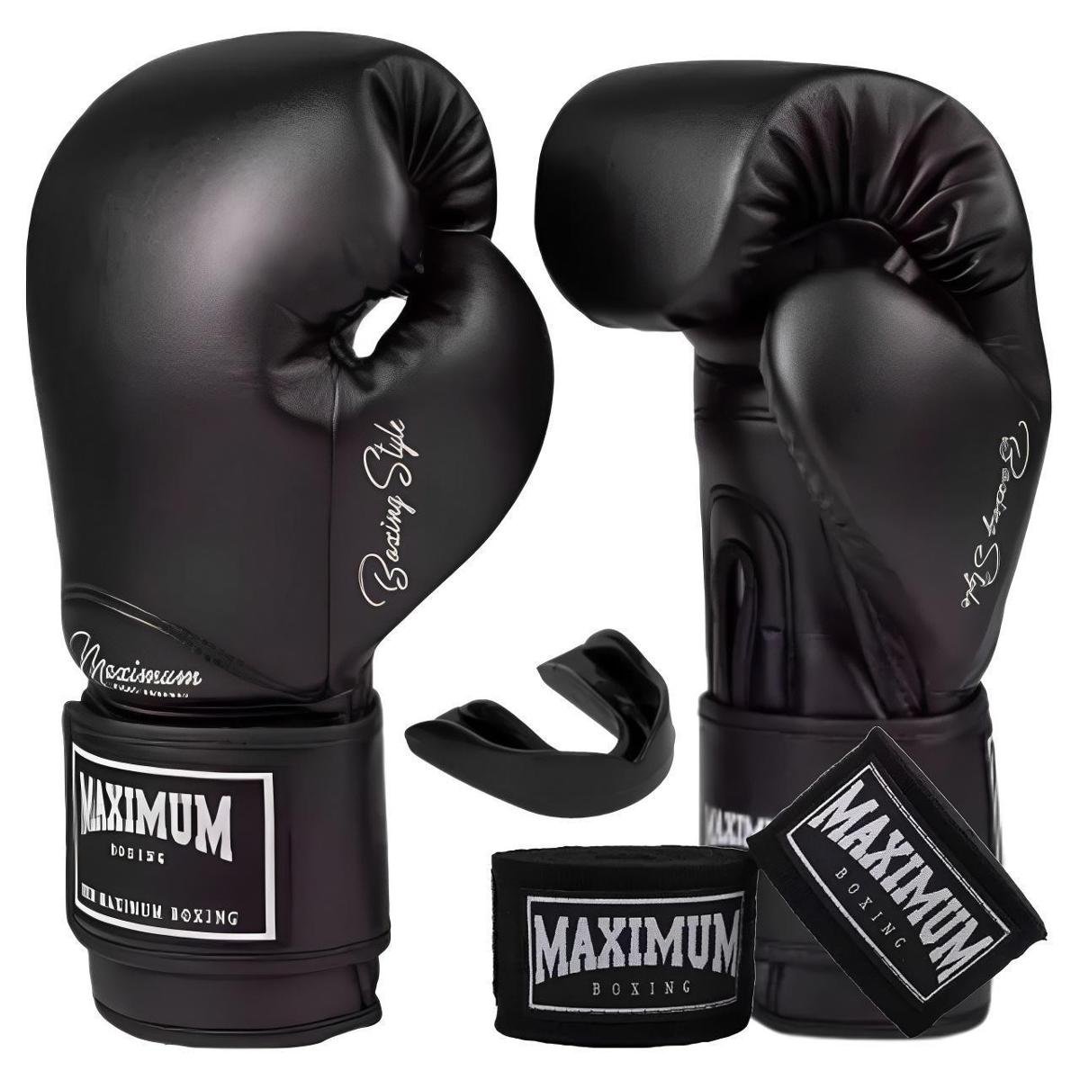 Kit Luva de Boxe Muay Thai Kickboxing Maximum New Classic Preto com Bandagem 3m e Protetor Bucal