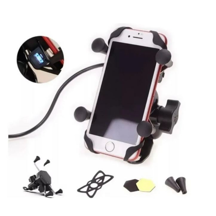 Suporte De Celular Para Moto Com Carregador Turbo Usb Garra Em X Universal Retrovisor Gps Motoboy