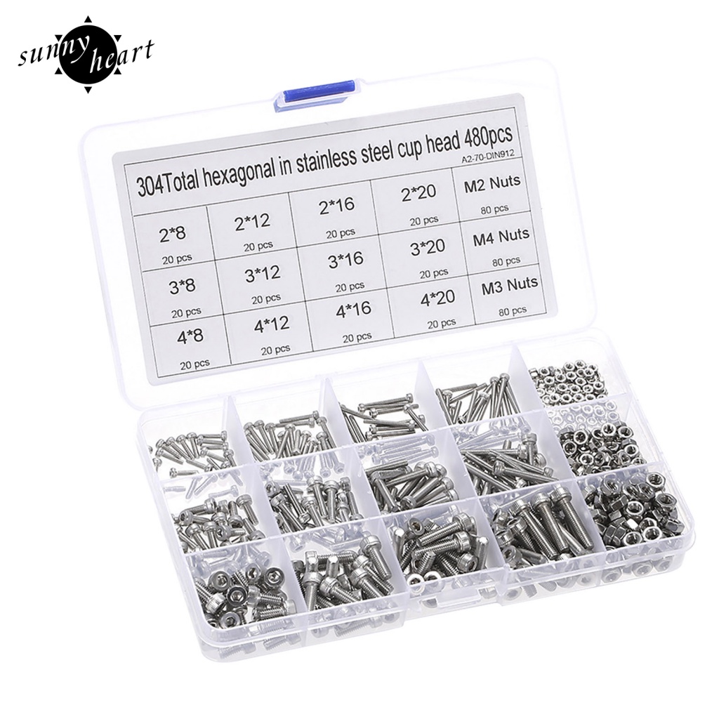 sunnyheart 480Pcs M2 M3 M4 Kit De Parafusos Cabeça Cilíndrica Hex Socket 304 Conjunto De Porcas De Aço Inoxidável De Superfície Lisa Para Casa