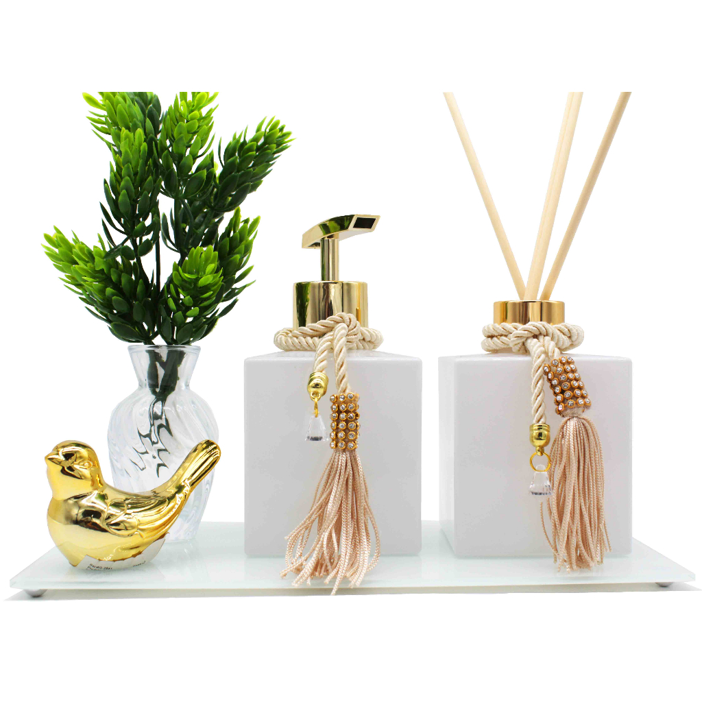Kit Lavabo Banheiro Luxo Porta Sabonete e Difusor C/ Bandeja + Enfeites