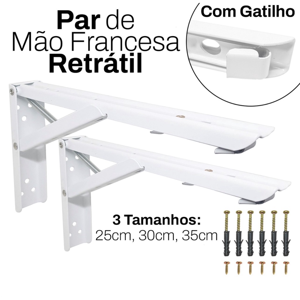 Suporte Mão Francesa Retrátil PAR (2un) Dobrável Reforçada Tampo Mesa - Tamanhos 25cm 30cm 35cm