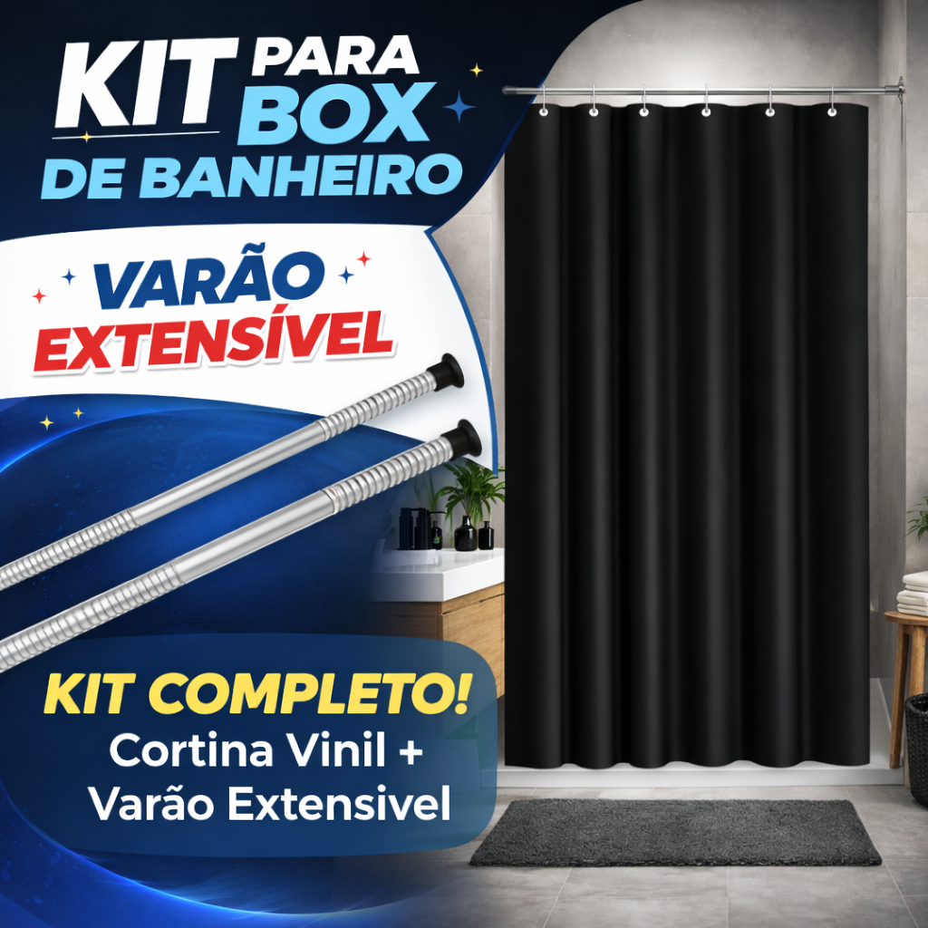 Kit Box Banheiro Completo Cortina Vinil Impermeável Antimofo + Varão Extensível em Alumínio