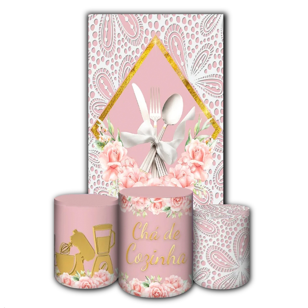 Kit Capa Painel Retangular + Trio Capas de Cilindros Sublimado Tema Chá De Cozinha