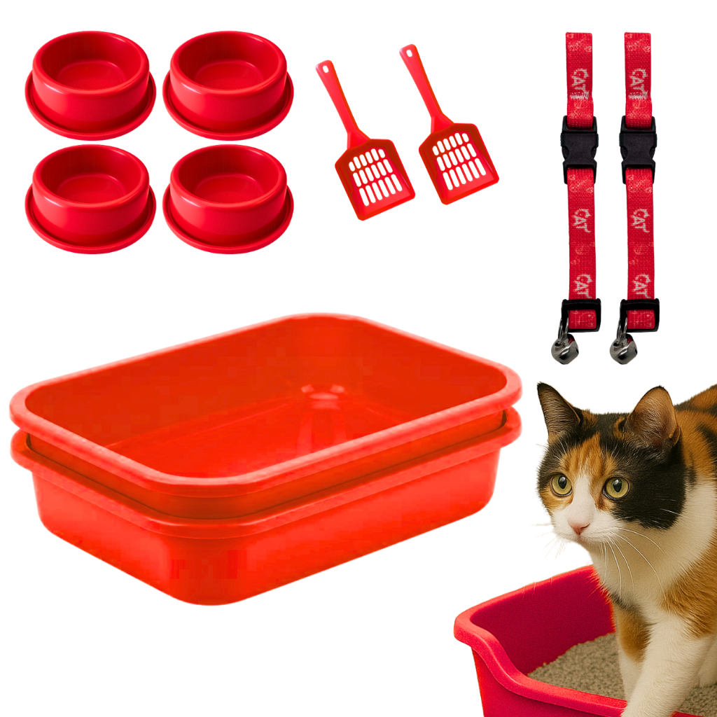 Kit Caixa de Areia para Gatos Bandeja 2 Comedouros e Pá Higiênica