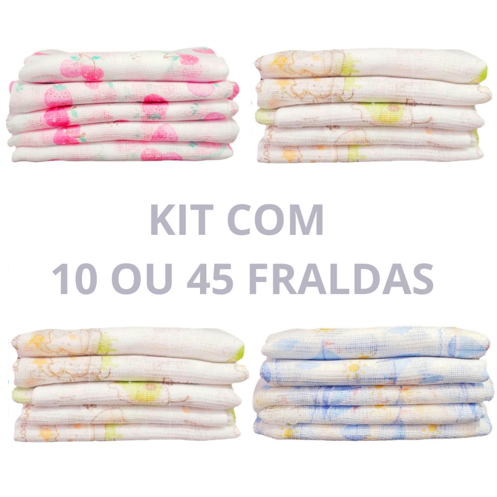 Kit de Fralda de Pano com 45 unidades Estampada para Bebê 60cm x 60cm 100% Algodão Enxoval