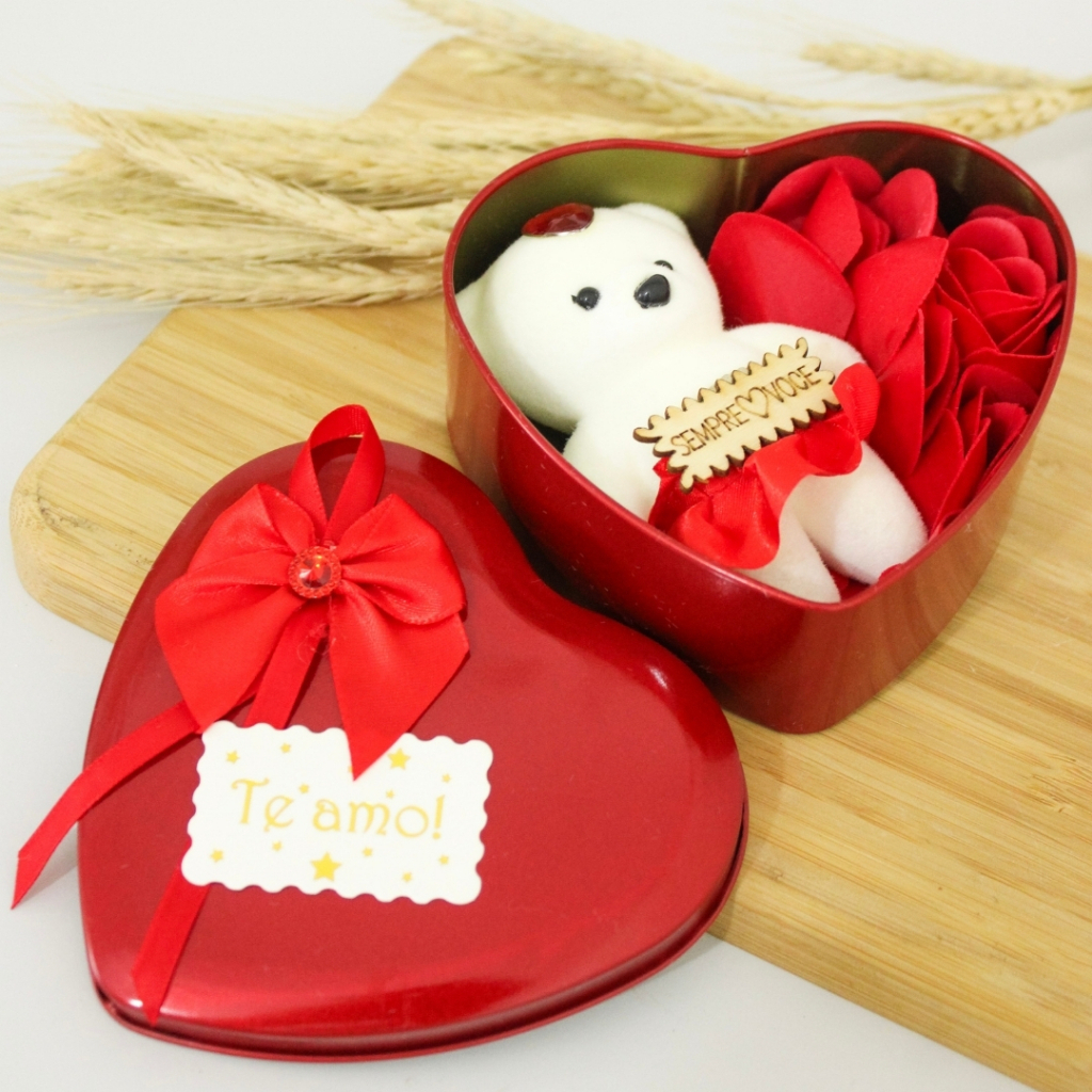 Caixa de Presente Coração Metal com Ursinho e Rosas Dia das Mães Namorados