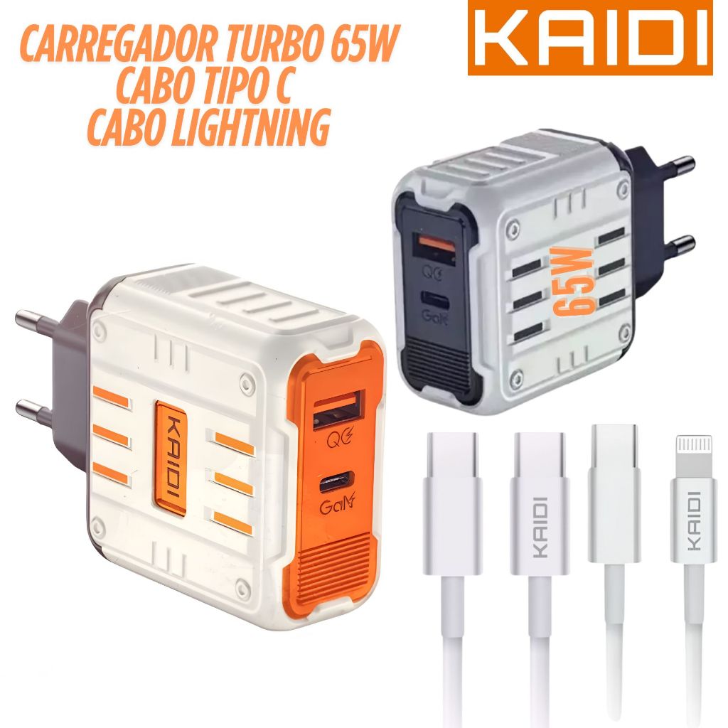 Carregador Tomada Fonte de Carregamento Turbo 65w com entrada Tipo-C e USB KAIDI KD-681