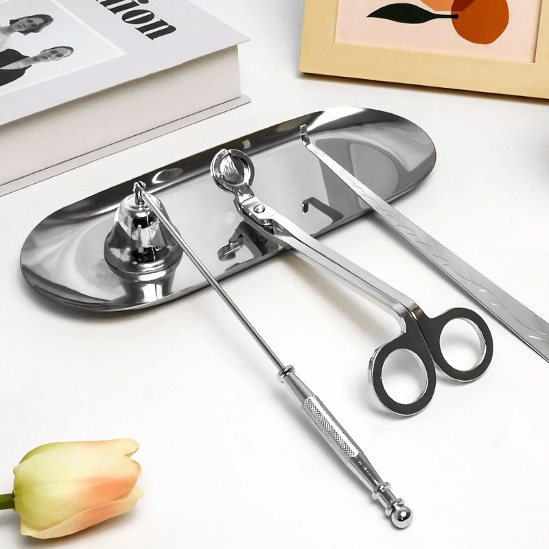 Kit para velas prata com bandeja, aparador, abafador e pegador/pinça - aço inoxidável.