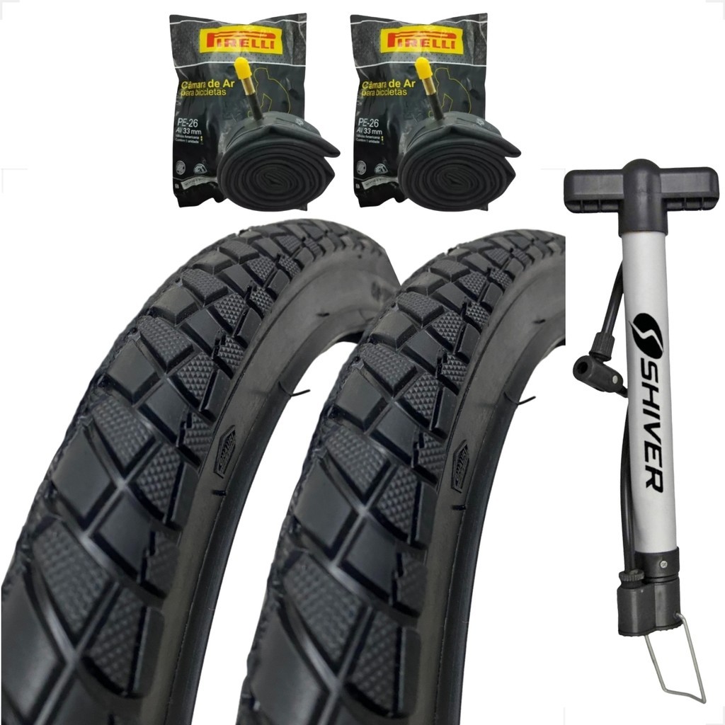 PAR Pneu Bicicleta Shiver tipo praieiro Aro 26 X 2.125 Caloi tropical + PAR Camara pirelli + Bomba