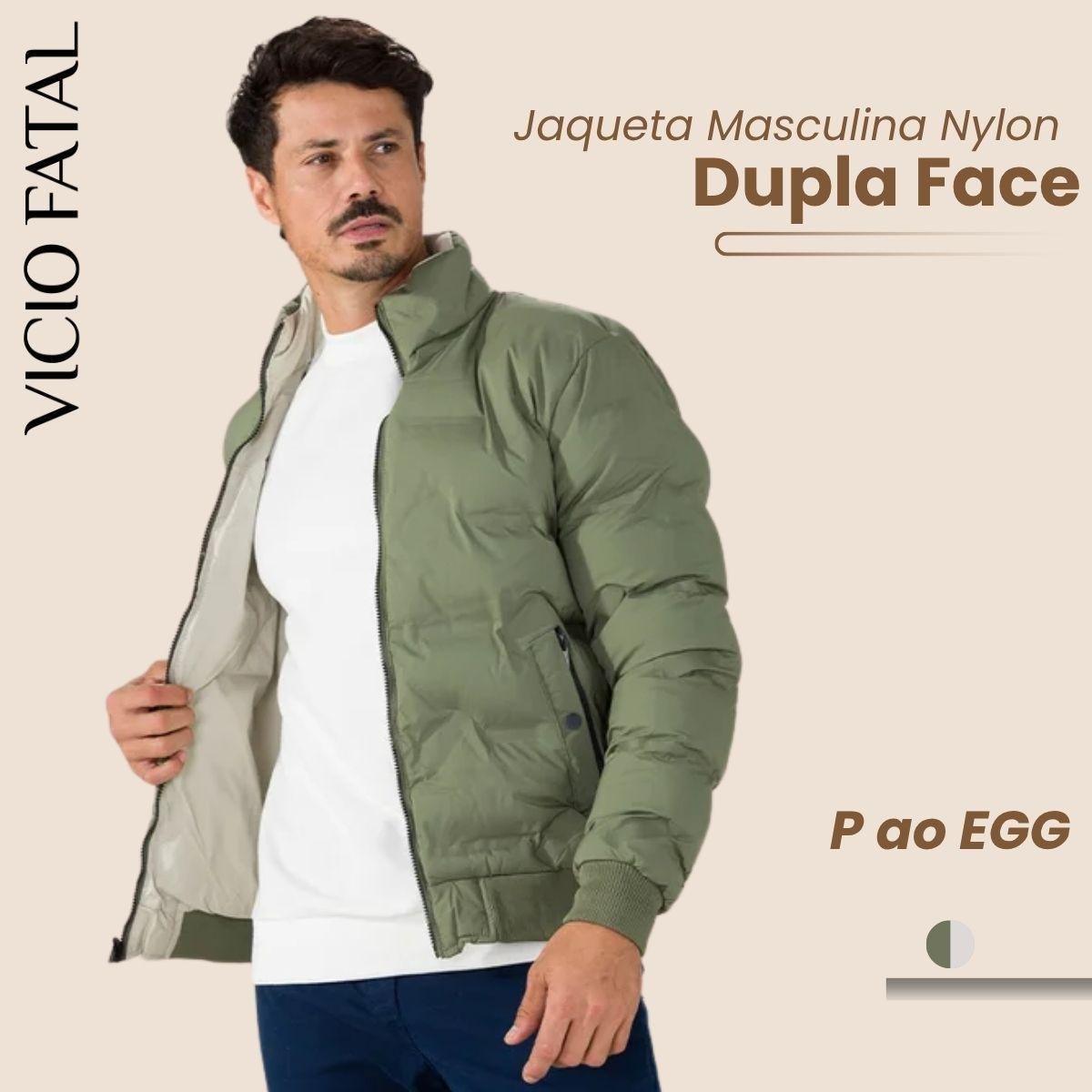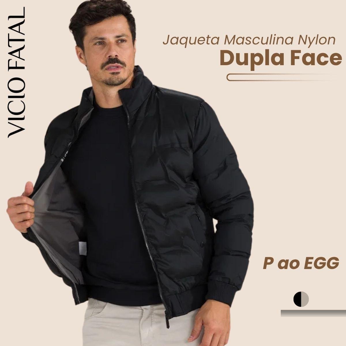 Jaqueta Masculina Nylon Dupla Face sem Capuz Gola Alta Bolso em Ziper