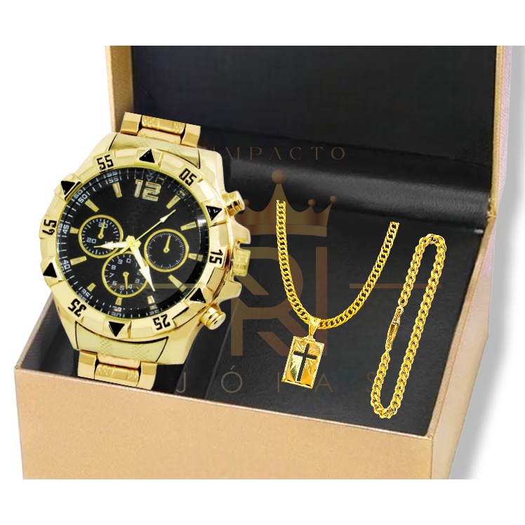 Conjunto Relógio Masculino Original + Colar Corrente Pingente Cruz e Pulseira Dourado . .