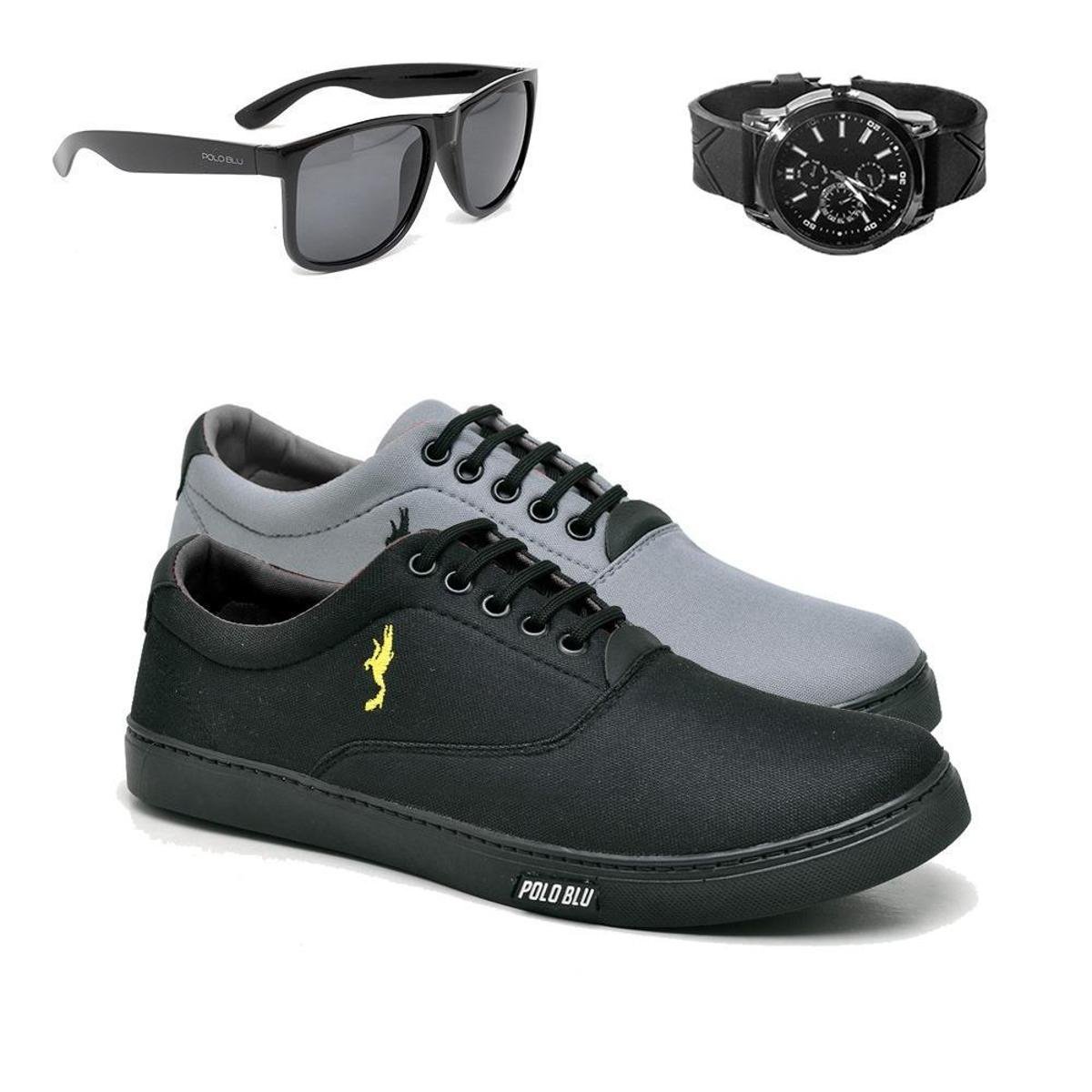Kit 2 Pares Sapatênis Masculino Polo Blu em Lona com Relógio Analógico + Óculos do 37 ao 46