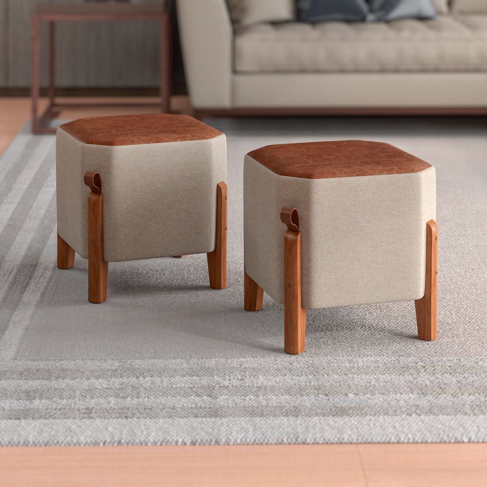 Kit 2 Puff Em Couro E Linho - Cor Bege E Caramelo - Pés Madeira Maciça - 42x32 Luma -