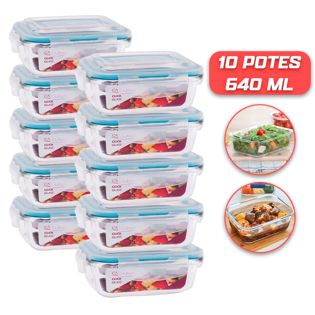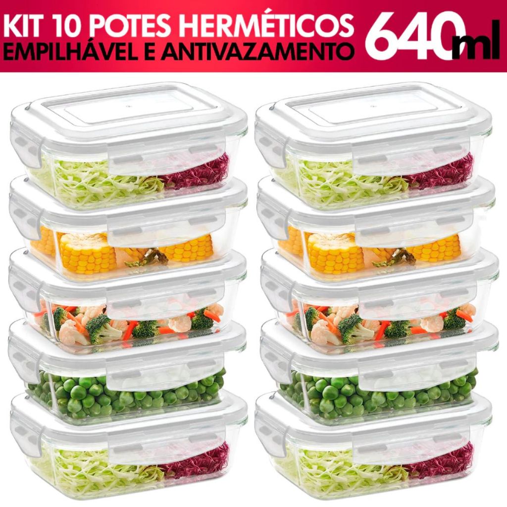 Kit 10 Potes de Vidro 640ml Hermético Marmita Fit com Tampa 4 Travas