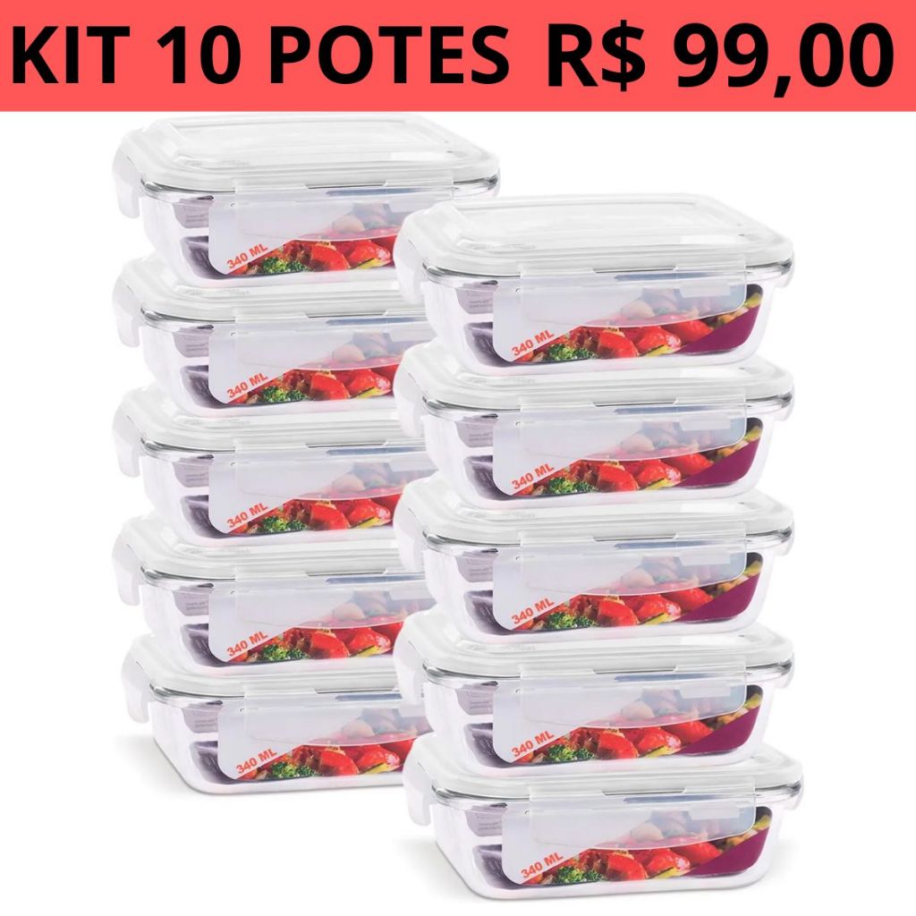 Kit 10 Pote Hermético de Vidro 340ml Marmita Fit Tampa 4 Travas Freezer Microondas Geladeira