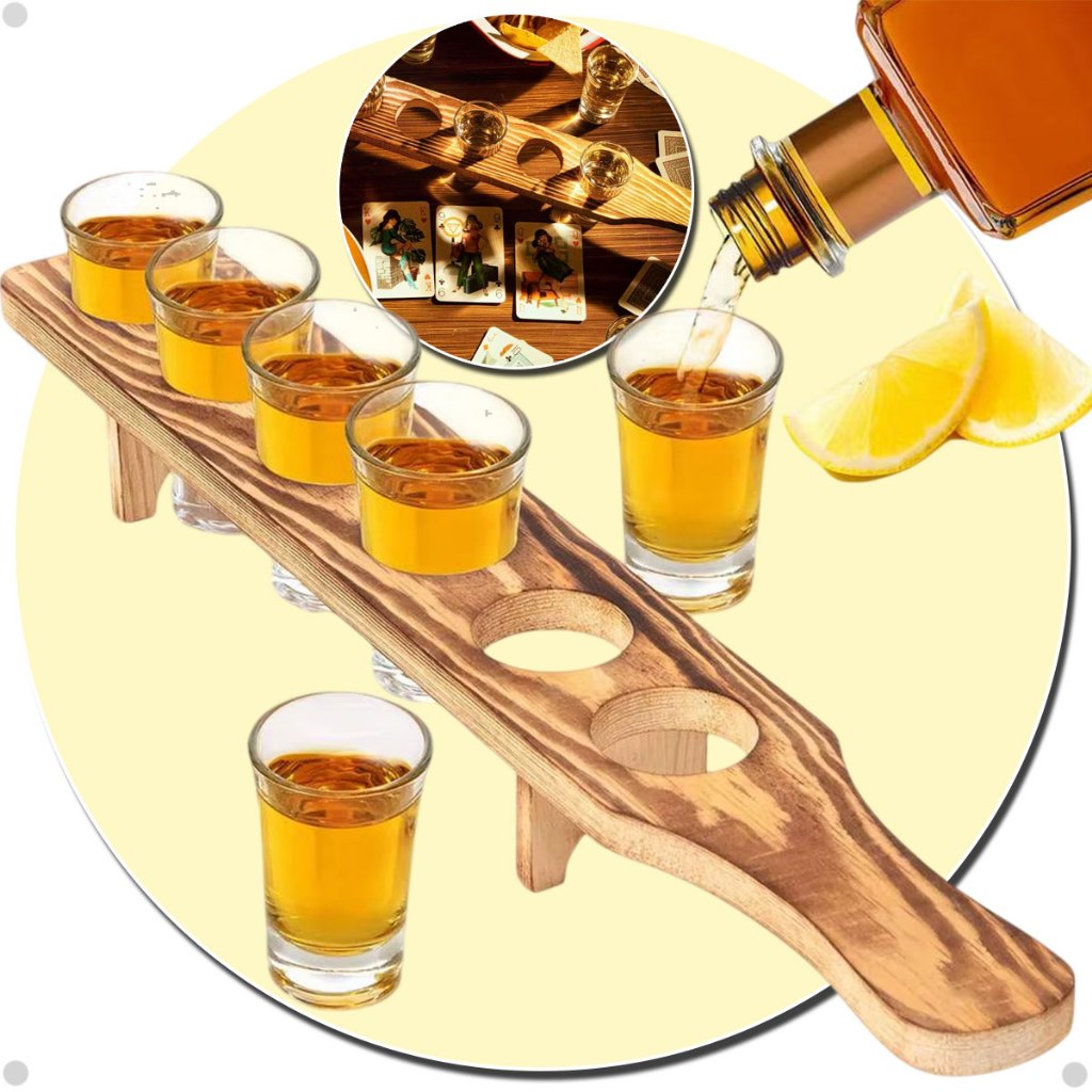 Kit 6 Copos Shots Dose Vidro 40 Ml Tequila Drinks Com Tábua Madeira Régua