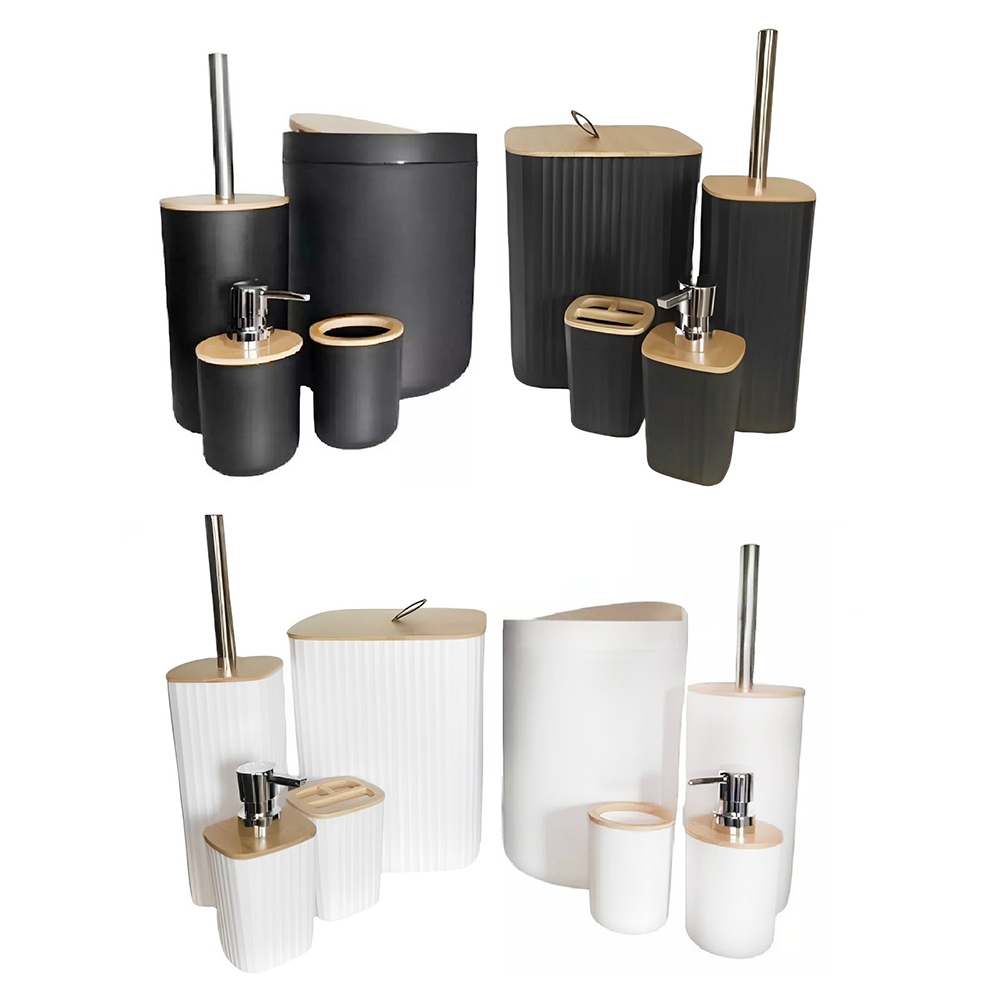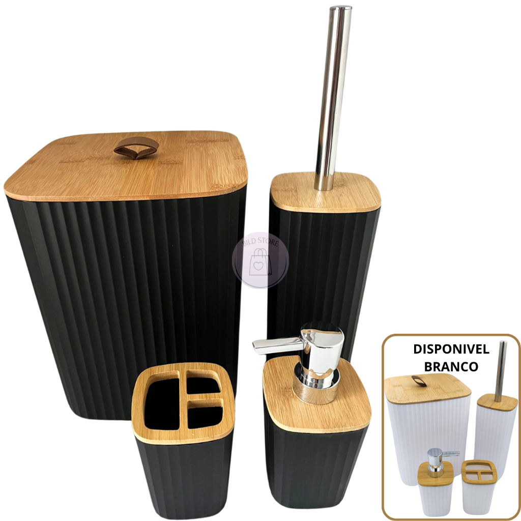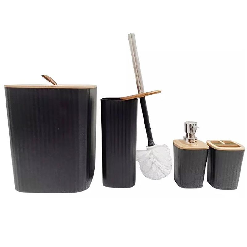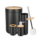 Kit 2, 4 ou 6 Peças Banheiro Preto Plastico Tampa Bambu Lixeira/ Escova Sanitária /Saboneteira /Porta Escova Dente