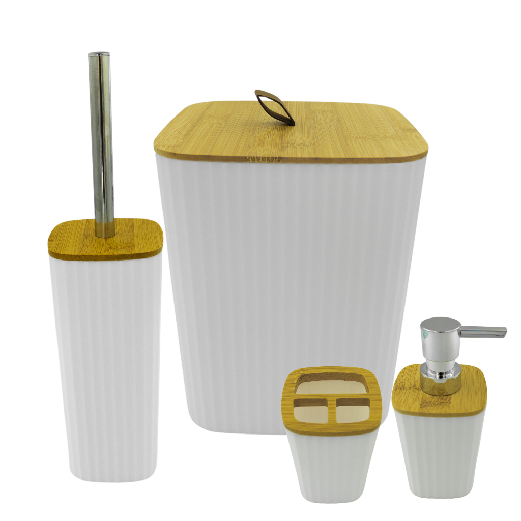 Kit 4 Peças Banheiro Lavabo Jogo Conjunto Bambu Lixeira Dispenser Multiuso Porta Escova Pasta Dente Combinar Reforçado Elegante Luxo