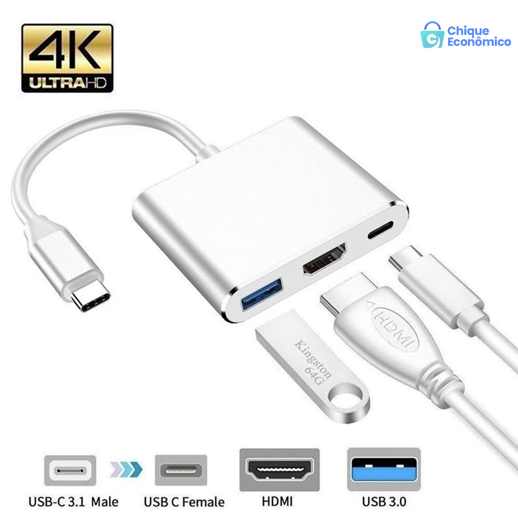 3 Em 1 Hub Type C Para HDMI USB 3.0 Conversor 4K/Adaptador De Concha De Alumínio