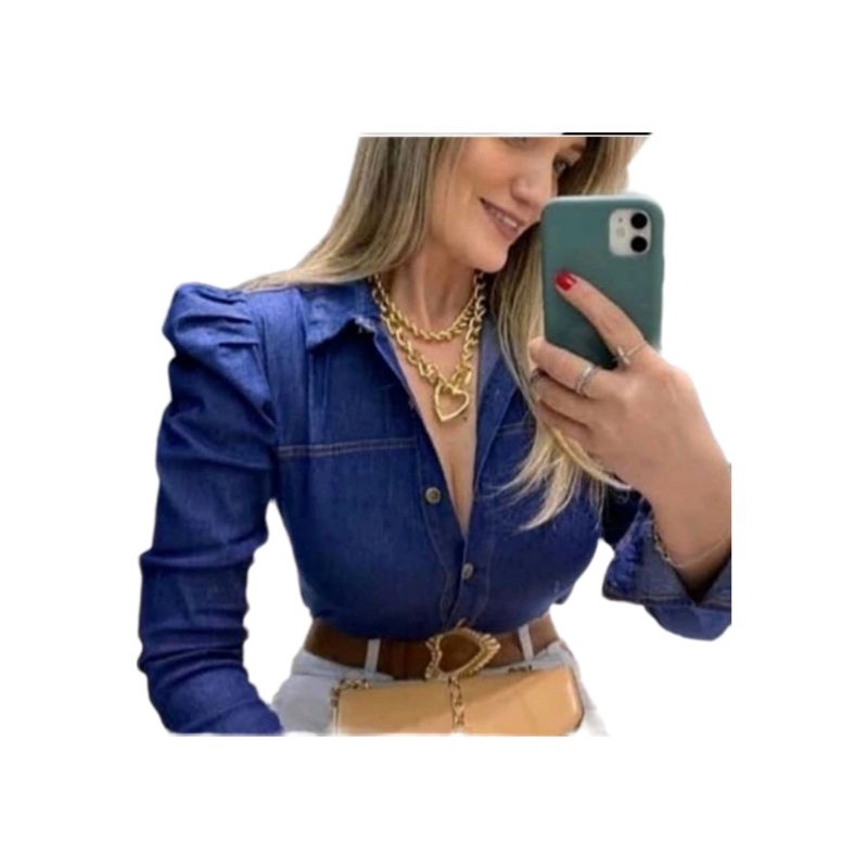 Camisa Jeans Feminina Manga Longa Bufante Princesa