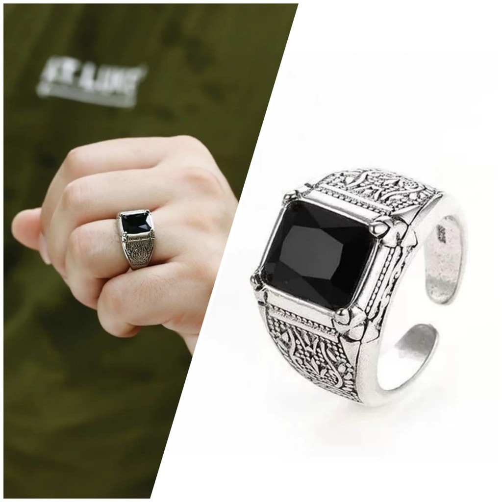 Anel Ajustável Com Pedra Preta Onix Masculino Regulável Comendador Motoqueiro Prata Prateado - APOC