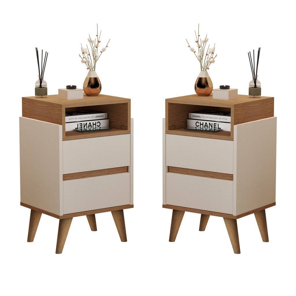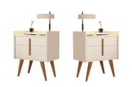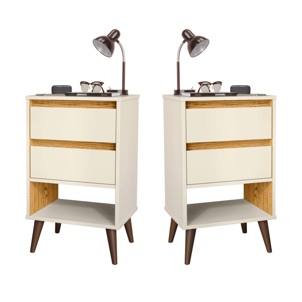Kit Duas Mesas De Cabeceira Retrô Pés Palito Em Madeira Maciça 2 Gavetas E 1 Nicho - Verona - Off White Com Nature - Lojas GD