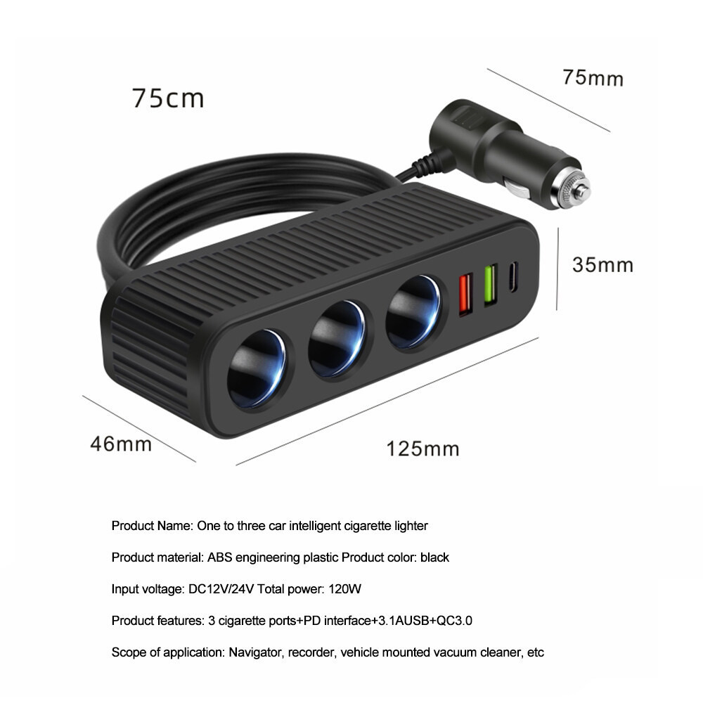 Adaptador De Isqueiro De Carro 120W 4 Em 1 12V/24V Tomada USB QC3.0 PD3.1A Carregador Rápido Para Plugue De Conversão De