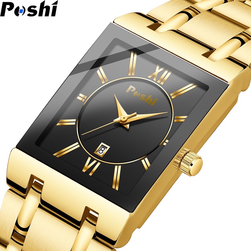 Relógio Masculino Original POSHI À Prova D'água 30M Quadrado Discagem Casual Moda Quartzo Homem Luminoso Ouro Aço Inoxidável Jam tangan lelaki