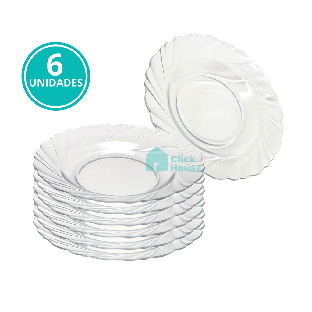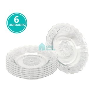 Jogo de 6 Pratos de Vidro Fundo Liso e Decorado 22 cm Almoço Jantar Mesa Transparente