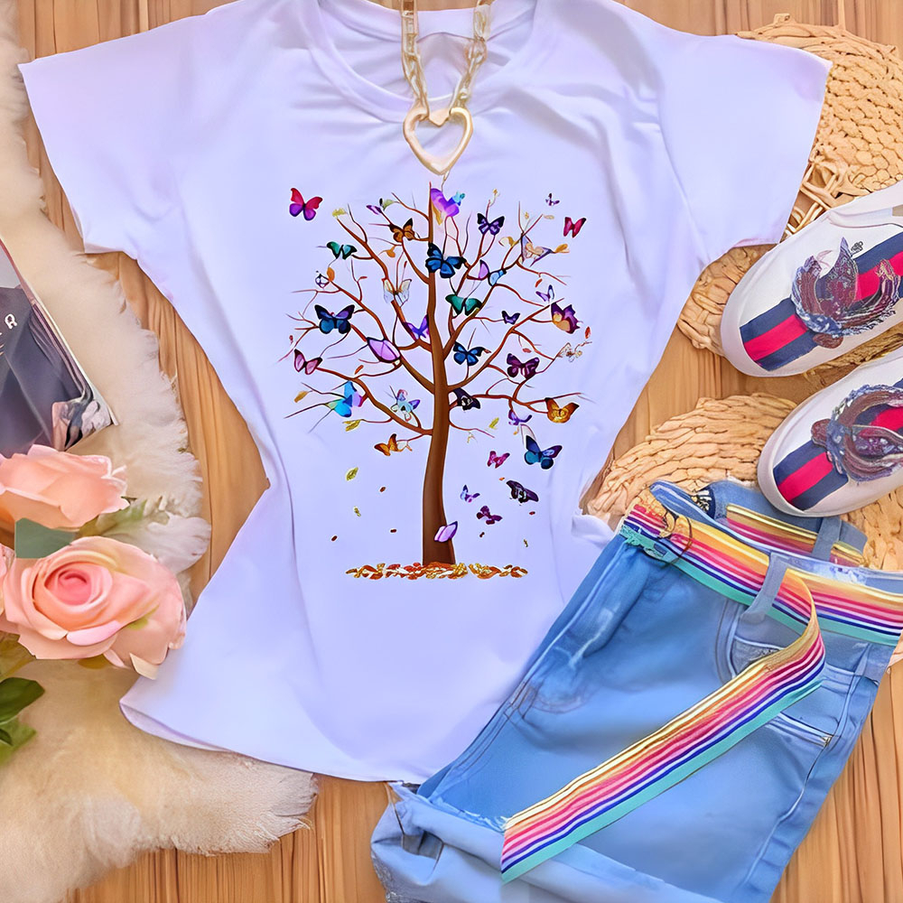 CAMISETA ÁRVORE BORBOLETAS BABY LOOK FEMININA BLUSA P ao XG