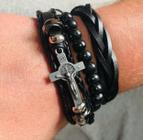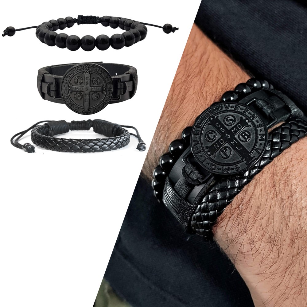 Pulseiras Masculinas Couro Religiosas São Bento Jesus Pai Nosso Kit C/03