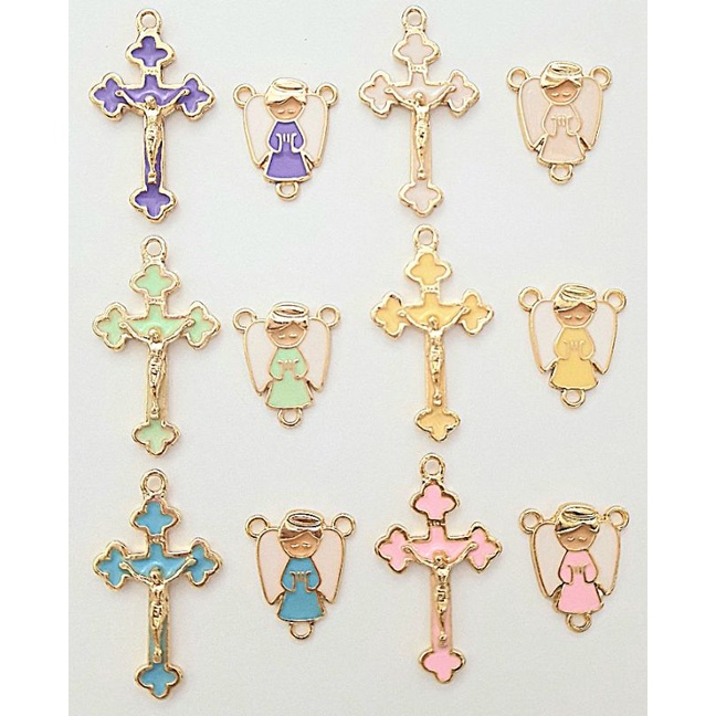 Kit 5 Entremeios de Anjinho + 5 Crucifixos Coloridos para Terço Infantil Terços Dezenas Escapularios Chaveiros Lembrancinhas Batizado Artesanato