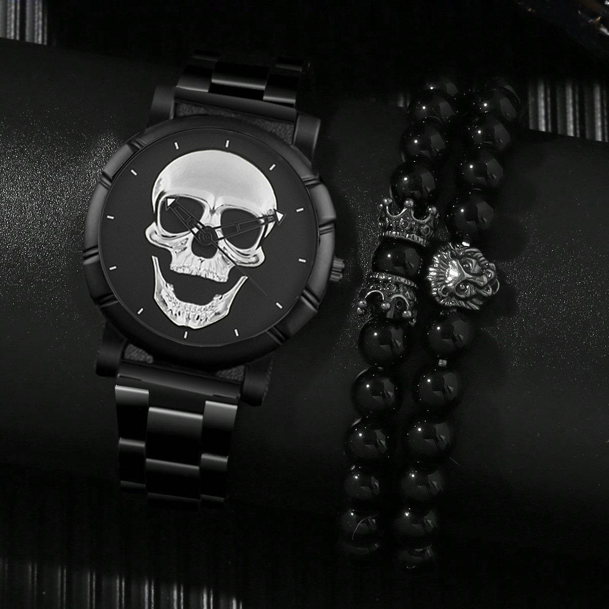 3pcs/set Tendência Da Moda Masculina Relógio De Quartzo Com Pulseira De Aço Crânio + Bracelete De Coroa Contas