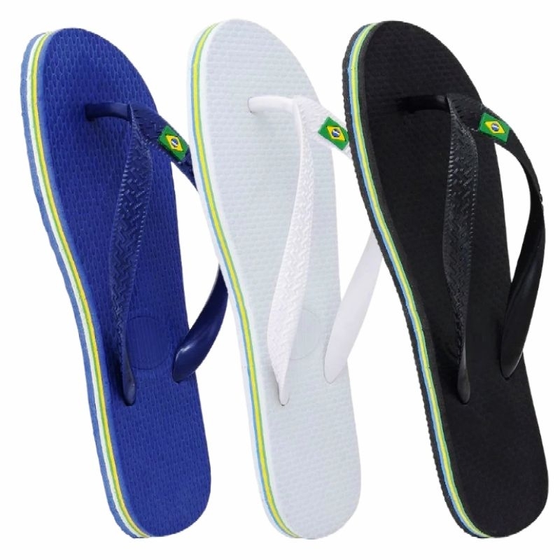 Kit com 2 pares de chinelos - Masculino - Tradicional - Liso - Branco com Bandeira do Brasil - Preto com Bandeira do Brasil - Azul com Bandeira do Brasil - Confortalvél - Chinelo que não Escorrega