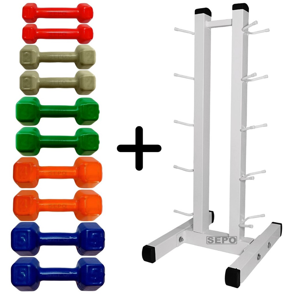 Kit Halteres Sextavados Pares de 1Kg ao 5Kg com Suporte de Chão Branco