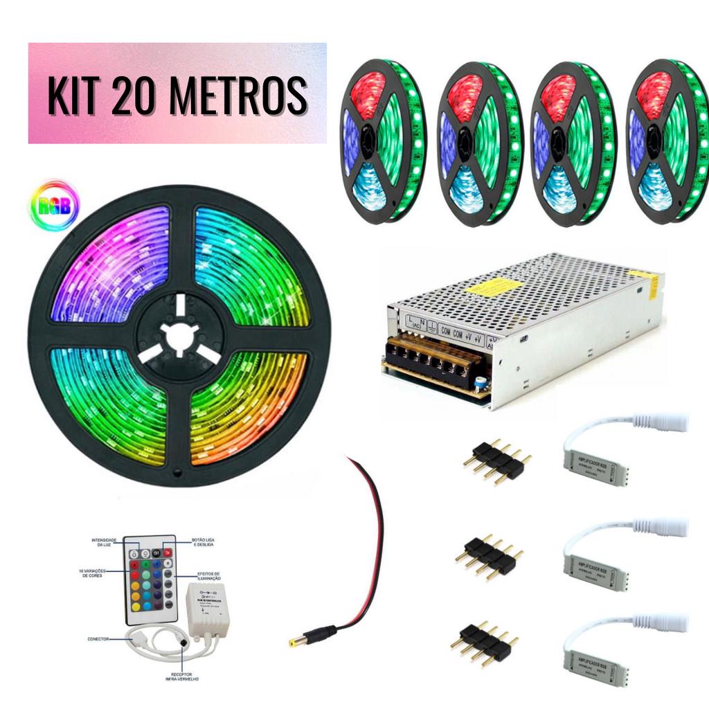 KIT 20 Metros Fita LED 5050 RGB Colorida com Silicone 12V + Amplificador + Fonte 20A