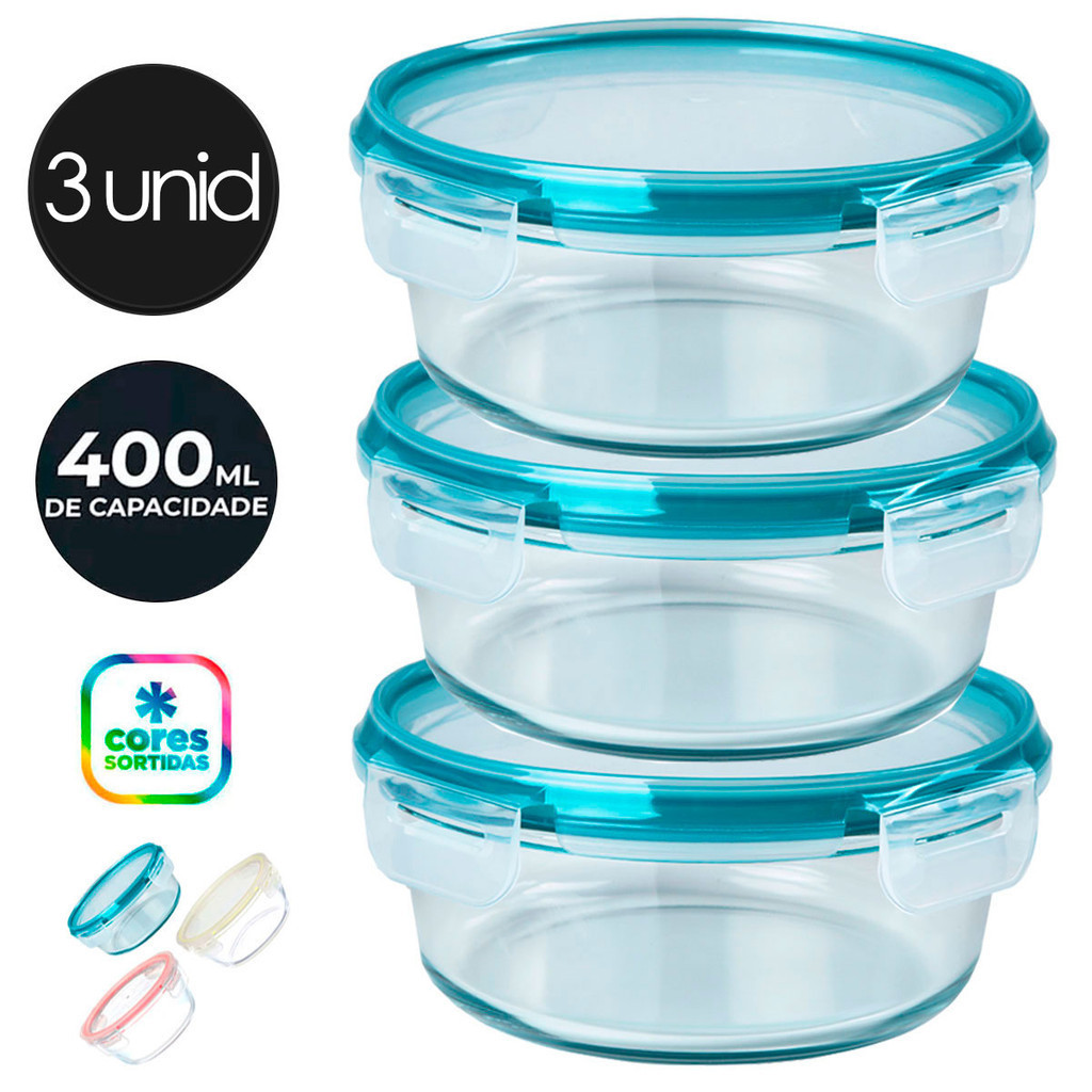Conjunto 3 Potes de Vidro com fechamento Hermético Marmita 400ml serve para Freezer e Microondas