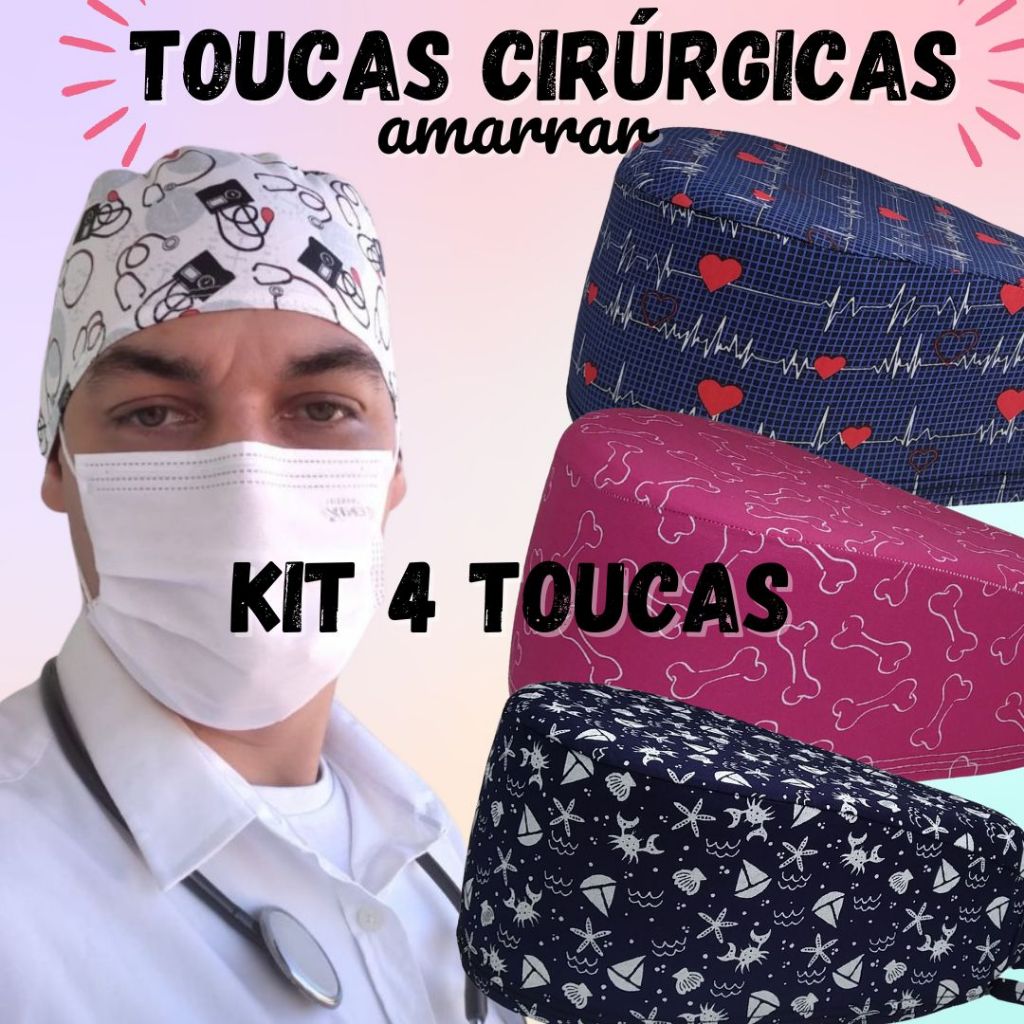 Kit Com 4 Toucas Cirúrgicas Gorro Bandana Veterinária Boleira Dentista Amarrar