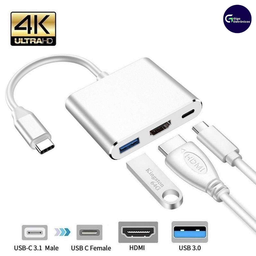 Conversor 4K 3 Em 1 Tipo C Para HDMI E USB 3.0 , Hub Com Caixa De Alumínio