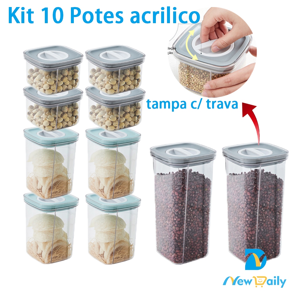 Kit 10 Potes pote Herméticos Acrílico Empilháveis Quadrado Para Alimentos Resistente Cozinha Dispensa. BC-83/BC-84/BC-85