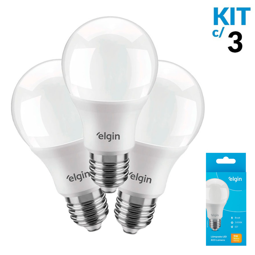 Kit com 3 Lâmpadas Bulbo Led 9W Bivolt 3000K Branco Quente Elgin